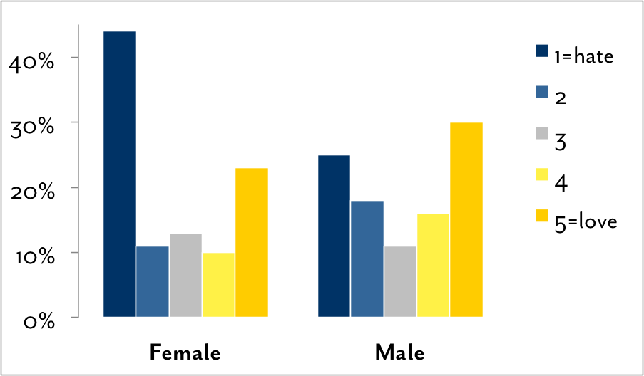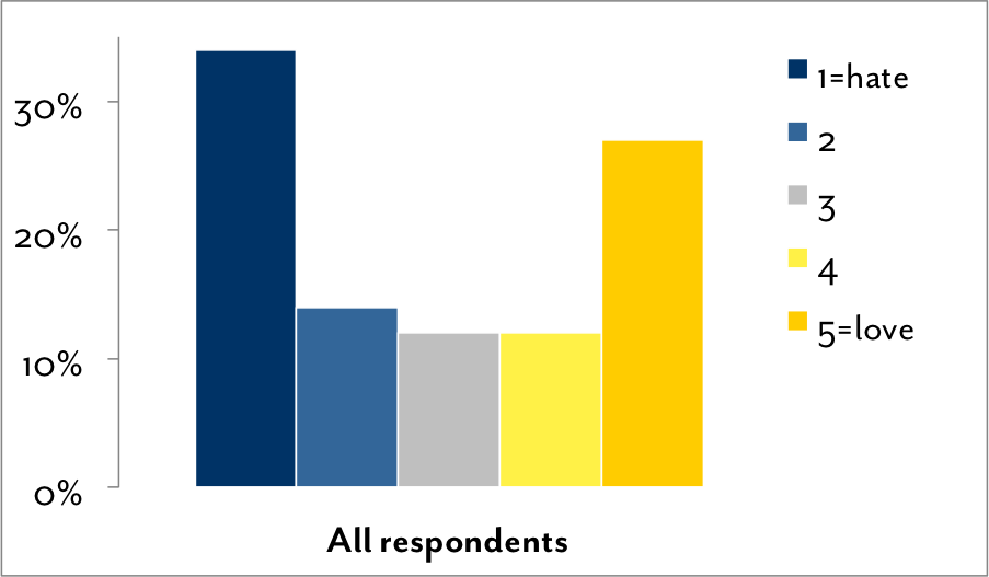 Across the three Blue Angels surveys, there has been no consistent split between lovers and haters. In the first survey, the ratings were almost evenly split between love and hate. In 2015, the fans came out in droves. And this year, the haters just edged out the fans, 34 percent to 27 percent. There was still a considerable trough of people in between, but just 12 percent gave neutral or ambivalent 3s. Once again, opinions about the Blue Angels tend to be pretty strong.