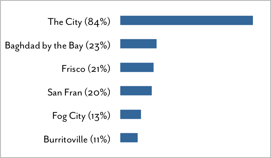 Last year, for fun, I asked respondents if it’s ever okay to call San Francsico “Frisco.” Nearly 80 percent said no. This year, I expanded the question to gauge attituides toward several nicknames for the city. Respondents overwhelmingly endorsed calling The City “The City.” About 23 percent signed off on the Herb Caenism “Baghdad by the Bay,” while just 11 percent bit on “Burritoville,” a moniker that I hope is never repeated beyond this survey.