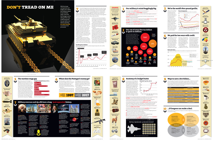 Don’t Tread on MeA cover package on where the Pentagon’s $600 billion-plus budget goes.design by carolyn perot • opening illustration by gluekit