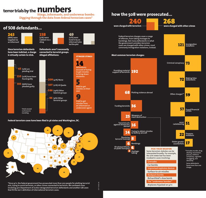 Terrorists for the FBIAnalyzing and visualzing a database of more than 500 federal terrorism cases. Part of an investigation into post-9/11 terrorism stings that won a Data Journalism Award. data collected by trevor aaronson • design by carolyn perot