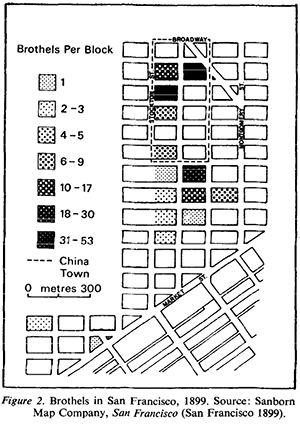 San Francisco’s red-light district in 1899."san francisco's zone of prostitution, 1880–1934"right inside the city’s semi-official prostitution district. (One study estimates that there were no fewer than 70 brothels within two blocks of Stark.)