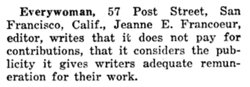And Doughnut Sal was an even more intriguing figure than Francoeur might have imagined. By the early 1900s, she had made a name up and down Northern California. Unrelated, but too good not to share: This ad posted in 1916 by Francoeur shows that freelancers have been paid in publicity for at least a century.