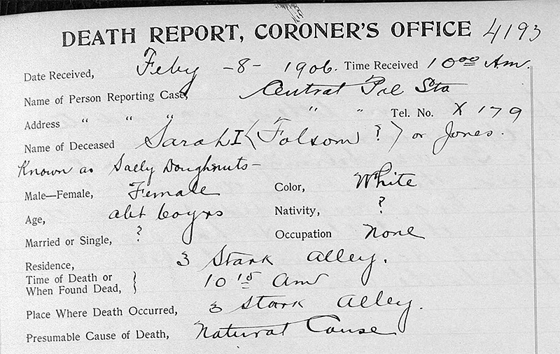 The building that now stands where Doughnut Sal used to live is currently valued at $3.7 million.Sal was found dead on February 8, 1906. According to the coroner’s report, a firefighter discovered her around 10:15 that morning. “She was lying in a filthy mess of old clothes, a broken lounge was alongside of her, from which she had evidently fallen off.” An autopsy concluded that she had died from pneumonia and chronic heart disease. The papers ran short items on her death. “In her prime she was known as one of the leading members of the half world,” the Call wrote in a short notice on the passing of “Sally Doughnuts.” “She was possessed of considerable wealth at one time.”