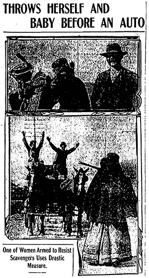 Tensions escalated when some of the directors of the city Chamber of Commerce drove down San Pablo Avenue to reconnoiter the dumping ground, followed by three garbage wagons. As the car approached, reported the Chronicle, Mrs. F.A. Olsen, holding an unloaded revolver, “threw herself and her infant in the path of the speeding machine in order to stop it.” The Call claimed that Olsen “hurled her baby and carriage” in front of the car. The vehicle reportedly stopped just in time. Meanwhile, wrote the Call, “afraid of their lives, the scavengers, after a short consultation, decided that discretion was the better part of valor and turned back their wagons and awaited orders from their chief.”